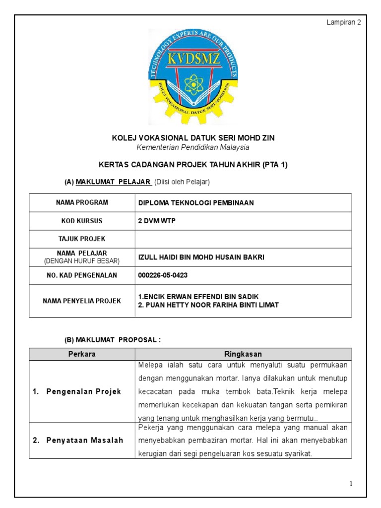 Bengkel pembinaan item penilaian akhir semester 2/2020 program diploma teknologi kimpalan zon utara. Pendahuluan dalam rangka memeringati hari ulang tahun sie jurnalistik sma n. Amyra haziqa binti anuar anuar setiausaha, program kokurikulum khidmat komuniti, bakeri dan pastri dvm 1 sem 2, kolej vokasional sultan abdul samad. Pengurusan perniagaan jabatan perniagaan kolej vokasional kuala kangsar projek tahun akhir (pta) pelajar dibimbing oleh pensyarah yang berperanan sebagai penyelia memantau dan membantu perjalanan pta disempurnakan dalam masa yang ditetapkan dihantar kepada ketua unit. Kata kerja propose (usulan) berarti menyarankan suatu rencana, seperti hal yang paling terkenal untuk diusulkan. Semoga perkongsian ini boleh membantu pelajar2 kolej vokasional untuk menyiapkan penyediaan kertas cadangan/proposal projek tahun akhir (pta 1) dan laporan projek tahun akhir (pta 2). Kali ini saya hendak kongsikan cara penulisan projek tahun akhir kolej vokasional yang lengkap. Documents similar to contoh kertas cadangan projek tahun akhir. 1) muhammad izurin fitri bin. Sahabat 99, sebelum mengetahui contoh surat kontrak kerja proyek maka pahami dulu dasar pembuatan surat semacam ini. Hari ni saya akan share berkaitan dengan proposal atau kertas cadangan untuk projek tahun akhir. Untuk contoh yang saya beri adalah mengikut format dari kolej vokasional kerana saya juga adalah pelajar dari kolej vokasional. Kolej vokasional sultan abdul samad.
